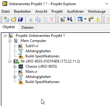 Folgendes Problem: Ich habe in einem Projekt zwei VIs und möchte, dass eines das andere öffnet. Nun habe ich Beispiele gefunden, in denen das auch wunderbar klappt, allerdings sobald ich diese zum Testen in mein Projekt hinzufüge, funktioniert es nicht mehr. Im Anhang befindet sich sowohl ein Screenshot der Projektstruktur, als auch die Datei.