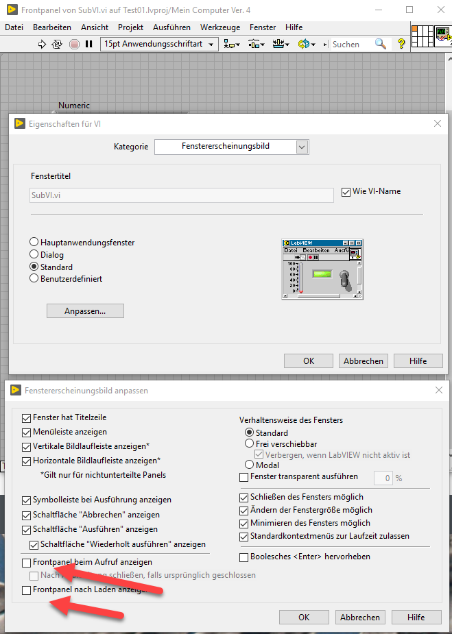 in der Einstellung des SubVI ist die Anzeige des Frontpanel ausgeschaltet.