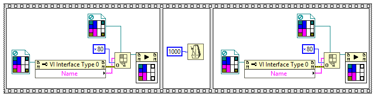 Das Beispiel ist rein exemplarisch. Links rufst du ein VI asynchron auf. Das VI startet und deine Sequenz läuft weiter. der mittlere Teil ist eine stumpfe Wartezeit und gibt dem ersten VI Zeit um sich zu initialisieren. Anschließend wird das zweite VI gestartet.