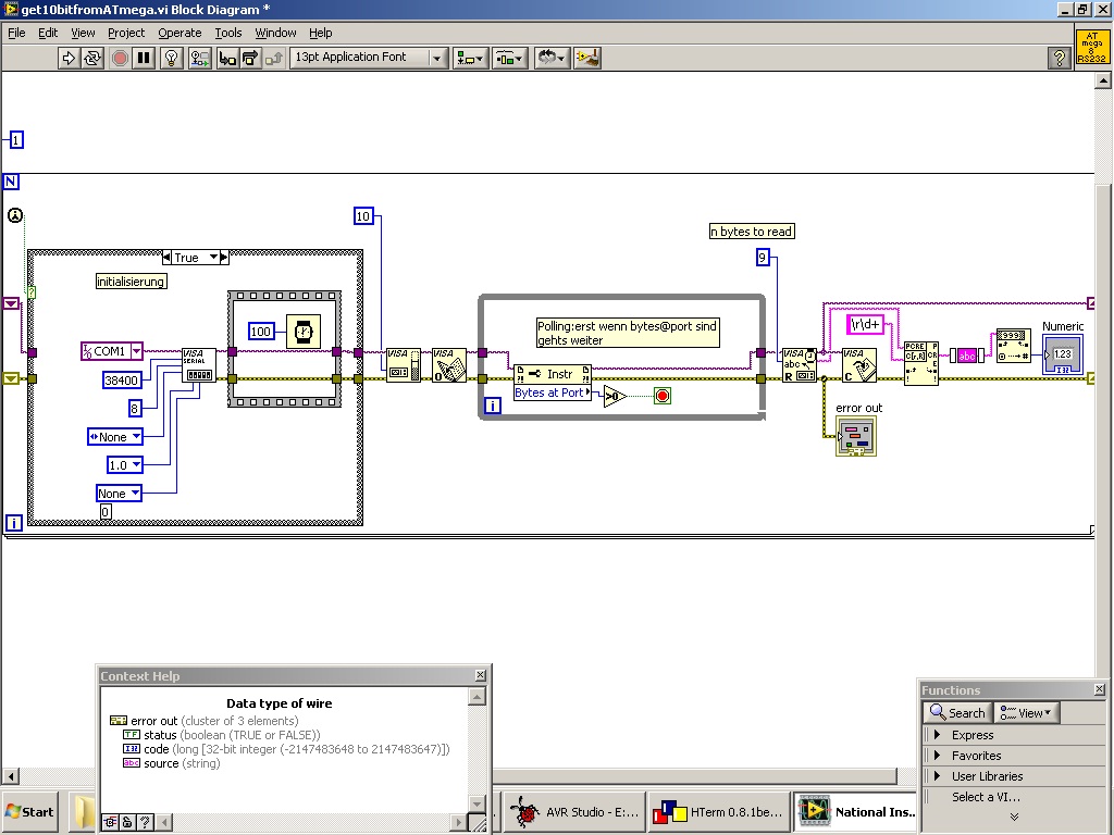Die Schleife "BytesAtPort" macht mir momentan am meisten Kopfzerbrechen- lasse ich das Vi (get10bitfromatmega.vi) dauerhaft durchlaufen kommt irgendwann ein Punkt, an dem BytesAtPort=0 ist, und auch bleibt, sodass ich nichtmehr aus der Schleife rauskomme- hatt Jemand da eine Lösung parat? Muss man irgendwie VISA dazu treten das Register neu zu füllen?