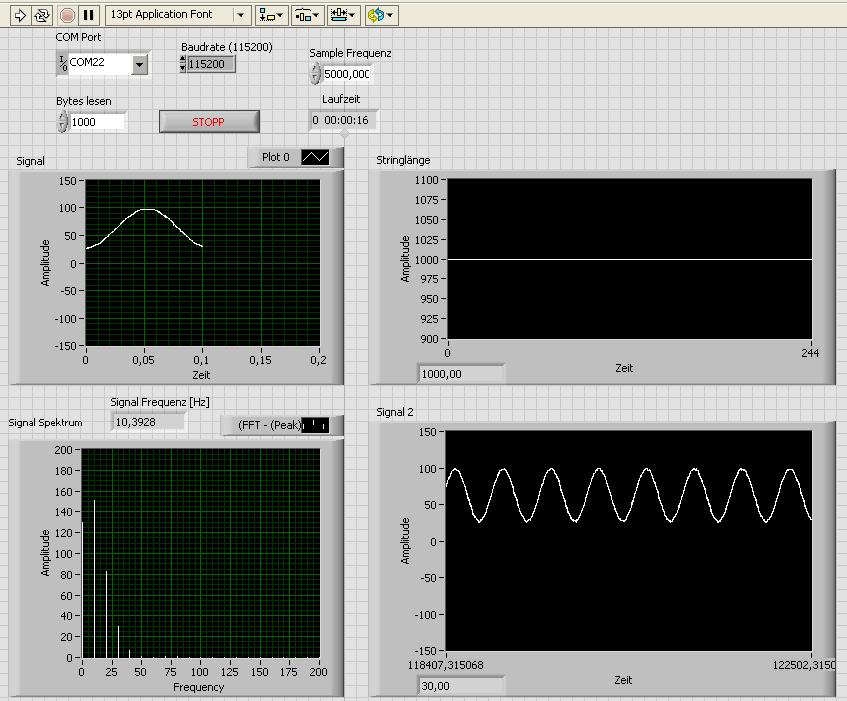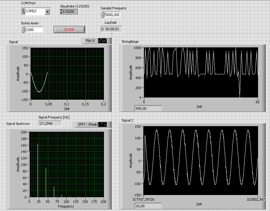 Der Datenstring, den ich vom COM-Port einlese, sollte eine konstante Länge in meinem Fall von 1000 Bytes haben. Die Stringlänge schwankt total und dadurch werden die Graphen völlig ruckelig. Das berechnete Frequenzspektrum ist nicht richtig und schwankt extrem. Nur bei einem Testsinussignal von genau 80 Hz kommen die Daten teilweise so an wie ich es will (siehe Bild 10 Hz; Bild 80 Hz).
