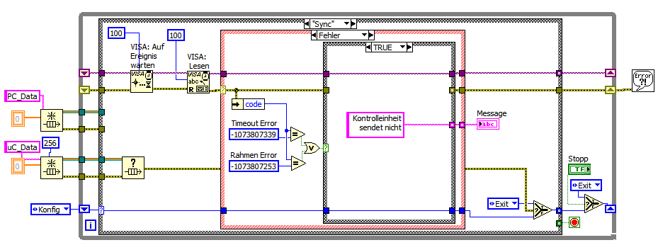 Also: Daß im Moment des Aufrufs des Lesen-VI noch kein Daten im Buffer sind, ist ganz normal und kein Grund für eine Fehlermeldung. Das VI wartet dann geduldig, und zwar so lange, bis eines von dem geschieht: