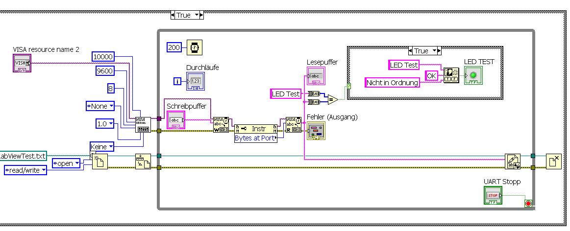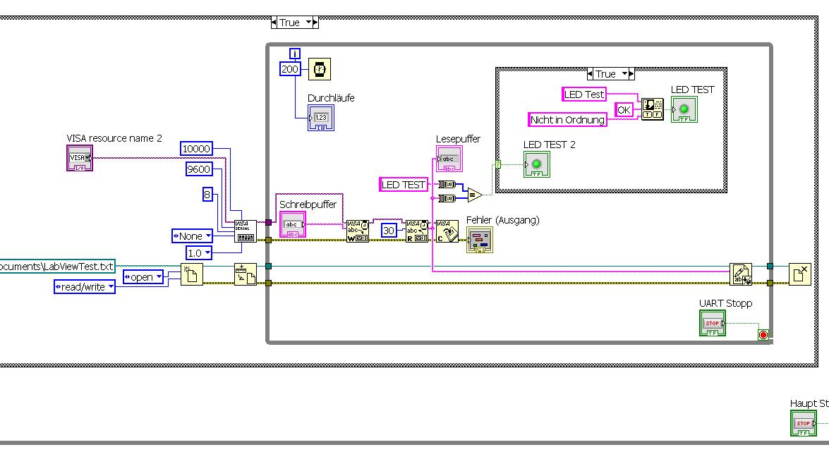 Sofern ich das auf dem letzten Bild deines Vis richtig sehe steht in der einen Leitung die zu U8 umgewandelt wird der Text aus der Konstante "LED TEST" und du sagst du empfängst aber "LED TEST\n\r" das ist natürlich nicht gleich ...