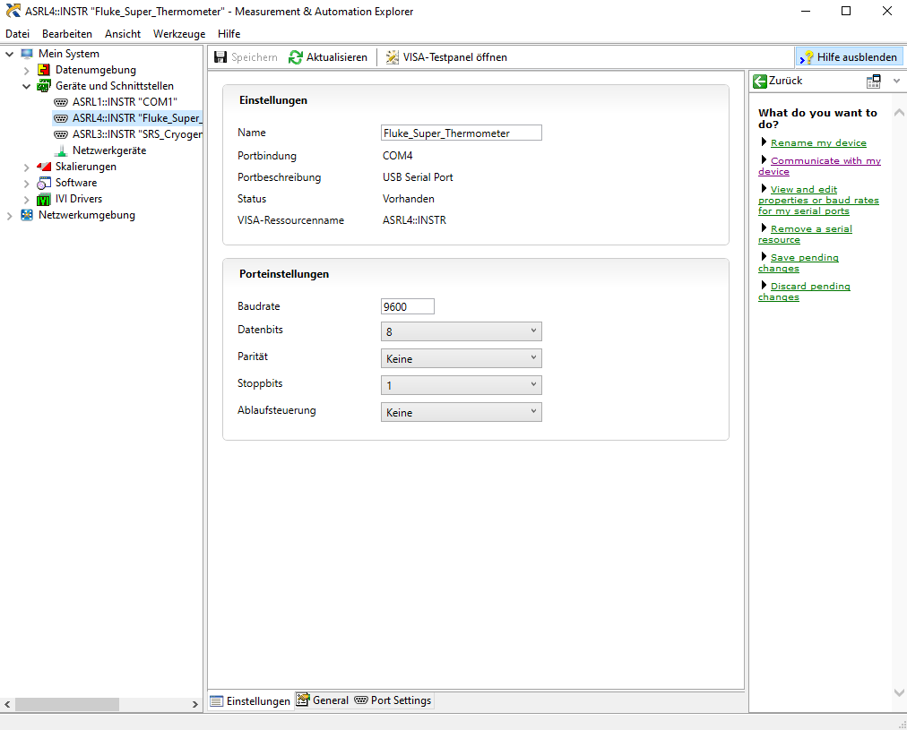 Soweit ich das Handbuch verstanden habe, müsste ich die Gerätekommunikation richtig gemacht haben. Ich habe ein USB Anschluss benutzt. Das MAX zeigt mir das Superthermometer an. Wenn ich mir über das VISA-Testpanel die ID des Gerätes ausgeben möchte klappt das auch. Also sollte der Computer, meines erachtens nach, mit dem Gerät kommunizieren.