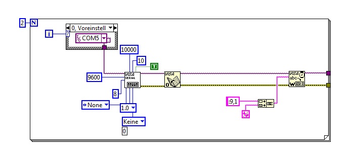 Die Funktion VisaWrite wartet nicht auf das Senden, sondern überträgt lediglich den Sendestring in den Sendepuffer, was 0,nix dauert. Ich vermute, dass es funktioniert, wenn Du nach visaWrite eine Wartezeit einschiebst. Ganz tödlich wäre es jedenfalls, wenn Du in den 2 Durchläufen der For-Schlefe jedesmal COM5 konfigurierst. Den Verdacht habe ich, dass es so ist. Wozu diese Konfiguration von 2 Schnittstellen überhaupt? Deine Beschreibung sagt dazu nichts. Ohne diese Schleife müsste es meines Erachtesn auch ohne Warten funktionieren. Also zuerst einfach mal N=1 setzen und probieren.