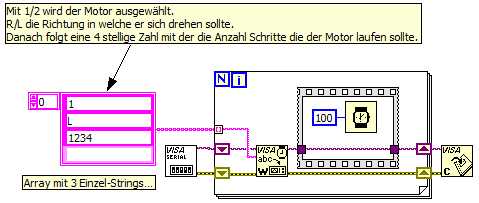 Ich möchte über einen RS 232 Stecker ein Gerät steuern. Mit der VISA Funktion gelang es mir den Charakter zu übertragen. Um bei meinem Gerät einen Motor zum drehen zu bringen muss ich folgendes übermitteln 1r1000