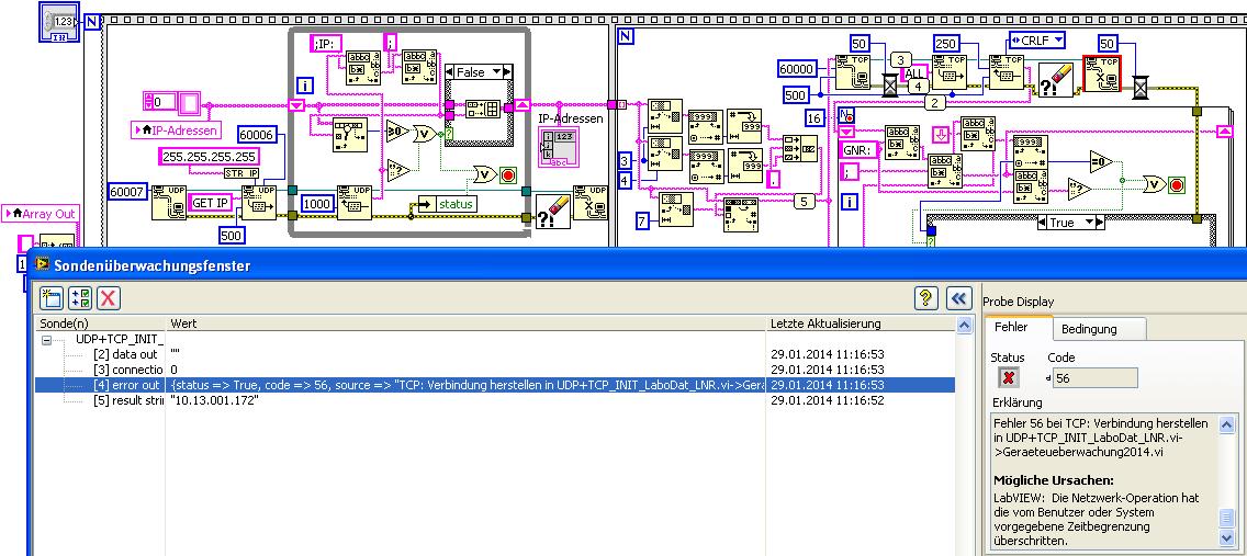 Eine alternative zum Port 60000 ist nicht möglich, weil nur auf diesen Port ich den Mirkocontroller ansprechen kann. Das VI/SubVI (siehe Bild 30.01.) funktioniert in 99% der Durchläufe fehlerfrei. Der einzigste Fall wo dies nicht geht, ist wenn ich vorher per UDP die IP-Adressen untereinander durchgetauscht habe und eine Wartezeit von 60 Sekunden nicht eingehalten wurde.