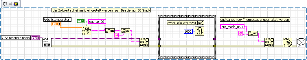 Beide Programme sollen aber nur einmalig ausgeführt werden. Das heißt der Sollwert soll einmalig eingestellt werden (zum Beispiel auf 50 Grad) und danach der Thermostat angeschaltet werden,... Heißt das ich könnte einfach die "Event Struktur" weglassen? Weil ich glaube so ähnlich habe ich es auch schon versucht,... Kann ich den Ausgang des ersten "VISA schreiben" zum Eingang des zweiten "VISA schreiben" führen?