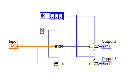 Im Blockdiagramm wird die Umwandlung nach FXP einmal mit dem Element "Nach Festkomma" und einmal mit "Typ Cast" gemacht: