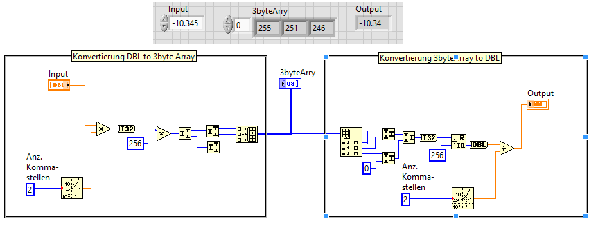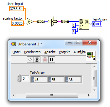 Der Benutzer kann auf dem Frontpanel einen gewünschten Double-Wert eingeben, dieser wird dann in ein 24 Bit FXP umgewandelt. Mein CAN-Bus Treiber erwartet ein U8 Byte Array, der Wert muss also noch auf 3 Byte aufgeteilt werden.