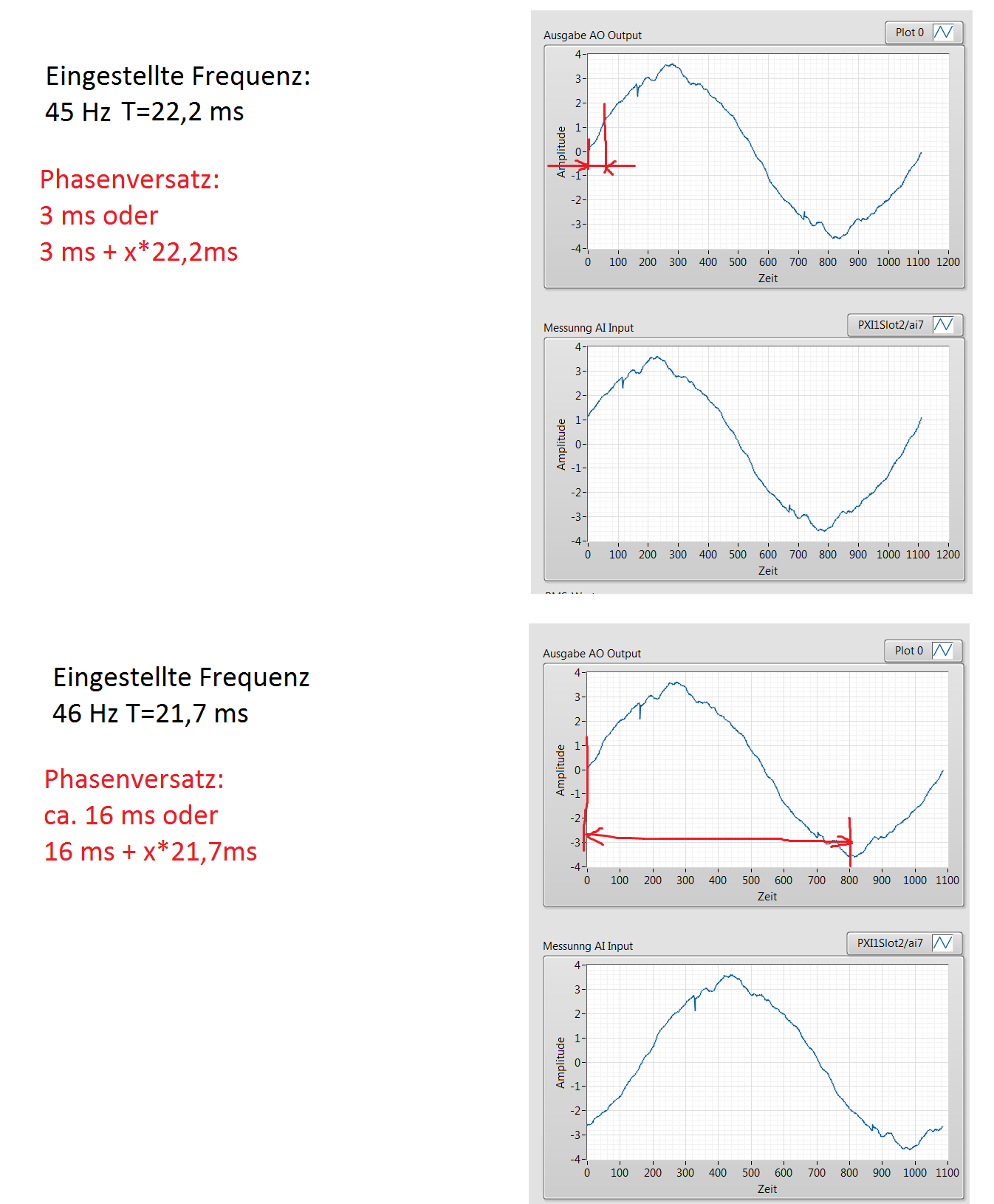 Dass das nicht geht ist mir klar, da ja der FIFO-Puffer von AO und AI auch noch dazwischen liegt. Im Beispiel ist das ganze einmal bei 45 Hz und 46 Hz Signalfrequenz dargestellt, und die Phasenverschiebung ist völlig unterschiedlich.