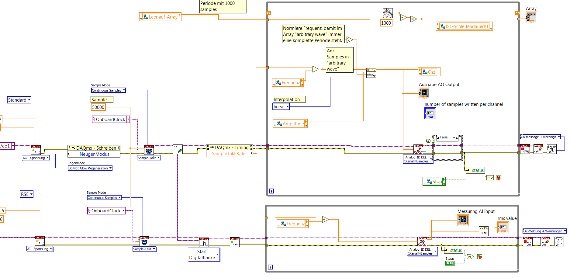 Nun möchte ich ja diese Anwort analysieren und weiterverarbeiten. Sprich ich möchte im gleichen Zeitraum, in dem eine Periode ausgegeben will auch wieder messen. Nur wie kann man das synchronisieren? Die Schleife zur Messung kann ja dann nicht einfach mit dem Start der ersten Schleife für die Analogausgabe synchronisiert werden, da ihre Dauer und der Startzeitpunkt ja undefiniert sind?