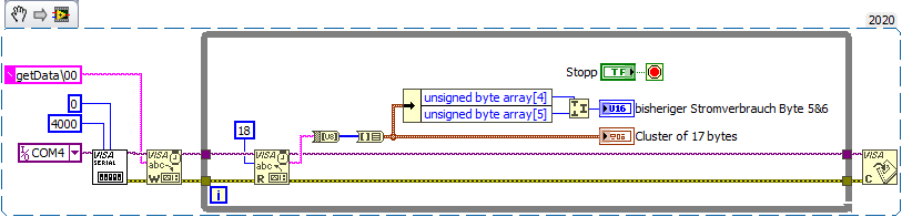 -Also in der Schleife werden dann 18 Byte gelesen und im Cluster ausgegeben, wobei nochmal das 4 und 5 byte selektiert werden und zu einem 16 bit Integer zusammengeführt und Dargestellt werden?