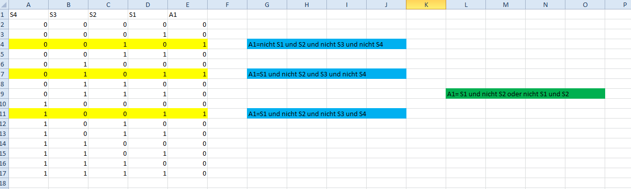 Hier entspricht ein true in der Tabelle dem Eingang, ein false NICHT(Eingang); diesmal wird innen verundet (entsprechend gibt der [] Ausdruck nur dann true aus, wenn die Zeile anliegt aus der er erstellt wurde) und aussen verodert (entsprechend wird für ein true in irgendeinem Klammerausdruck immer true ausgegeben).
