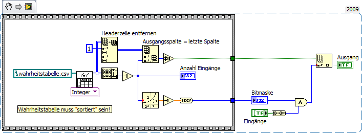 Was das programm dann machen muss: bei setzen des Eingänge Reglers wird automatisch das Bool Array entsprechend einer solchen Tabelle vorbelegt mit Ausgangsbelegungen alle auf False (zum Beispiel). Das String Array wird mit Bezeichnern gefüllt (die nur dazu dienen dass der Nutzer versteht wie das Bool Array zu verstehen ist.