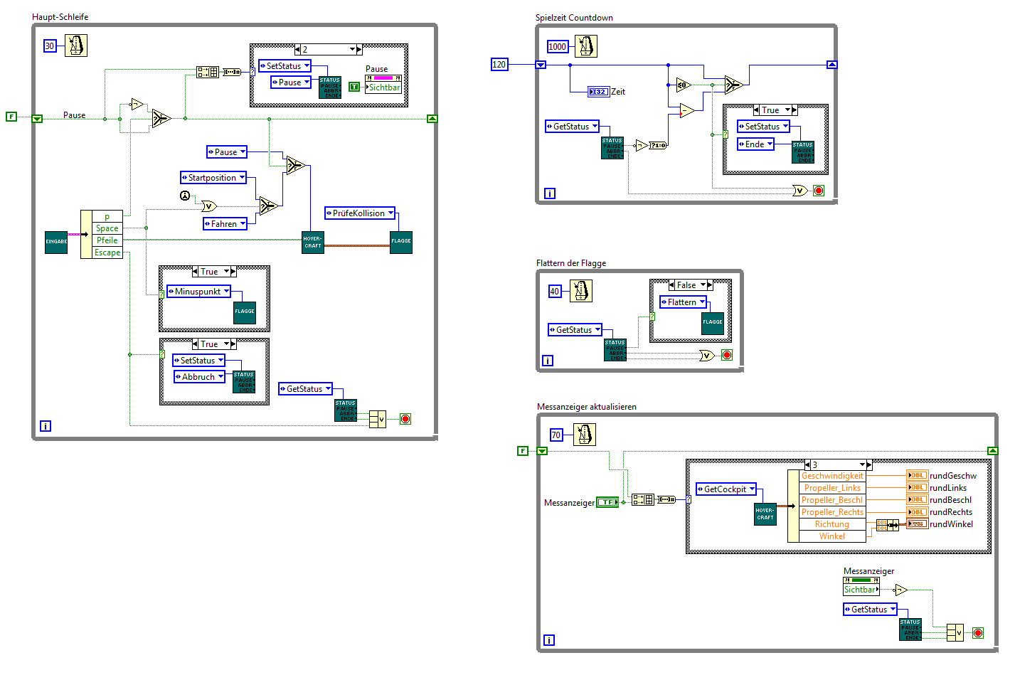 in meinem Projekt, einem Spiel, in dem mit einem Luftkissenboot ein sich zufällig platzierendes Objekt (eine flatternde Flagge) gegen die Zeit eingesammelt werden muss, laufen 4 Whileschleigen parallel.