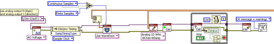 As seen in the block diagram I can select whether the waveform content is outputted only once ("finite samples") or repetitiously ("continuous samples"). However I want to repeat it only for an exact defined number, let's say exact 100 times. Also If I stop it manually the output should stop at the end of a waveform cycle and not anywhere. I have three options: