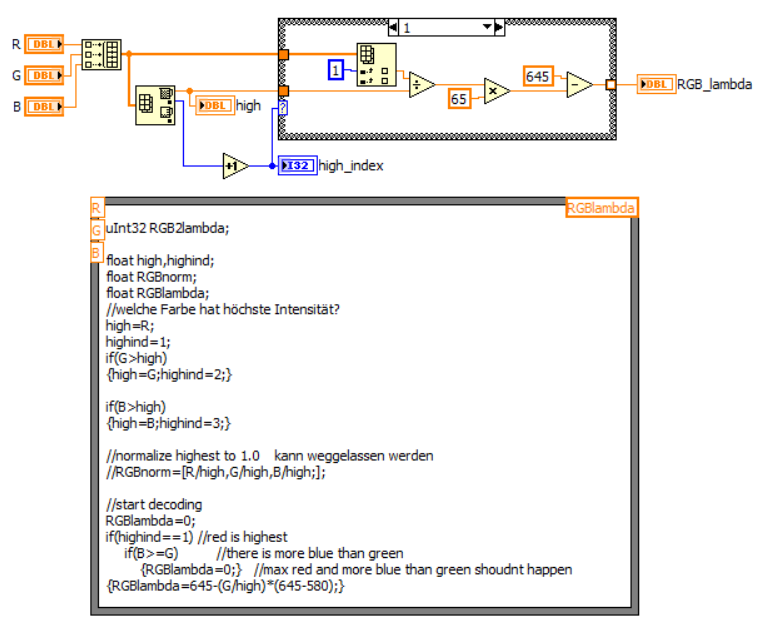 Du musst also nur schauen, welcher RGB-Wert in dieser Tabelle deinem aktuellen Messwert am nächsten kommt und die zugehörige Wellenlänge ausgeben…