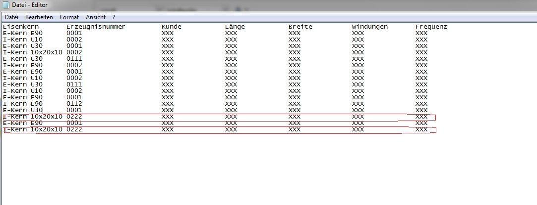 Interessant wäre noch wie du die einzelnen Werte getrennt hast. Falls du dabei etwa den Tabulator verwendet hast könnte man das ganze in ein 1D-Array oder 2D-Array of String umwandeln und nur die betroffenen Spalten überprüfen. Ansonsten kann es vorkommen, dass du einen Eintrag mit 0222 findest in der Zeile welcher jedoch nicht die Erzeugnisnummer ist.