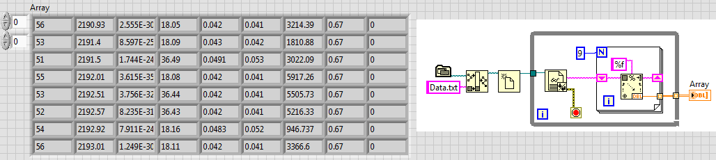 @Lucki: Danke für die schöne Lösung. Ist erstaunlich dass LV die zusammenhängenden Zahlen richtig interpretiert (vor allem auch bei "-.076"). Für meine Zwecke ist das vollkommen ausreichend und zweckmäßig. Allerdings gibt es tatsächlich einen Fehler, wenn die Anzahl der Schleifendurchläufe erhöht wird, da zwischendrin ein Buchstabe vorkommt (bei anderen Datensätzen durchaus öfter der Fall). Aber wie gesagt, da ich nicht alles auslesen muss, kann ich damit sehr gut was anfangen.