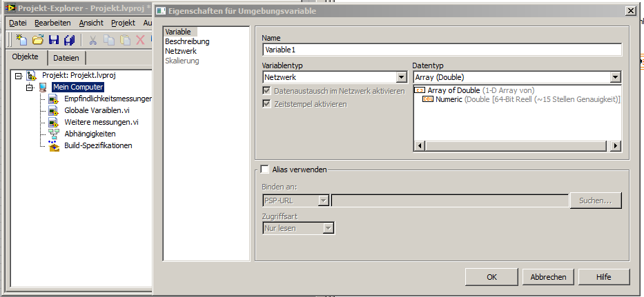 Damit ich nicht immer wieder die (rel. Zeitaufwendige) Empfindlichkeitsmessung durchführen muss(Ich brauche aber die gemessenen Werte bei fast jederMessung), möchte ich gerne die Emittelten werde (von einem Messgeräte eingelesen, geht alles schon) in eine Array Variable speichern, die auch in anderen VI's zu verfügung stehen soll!