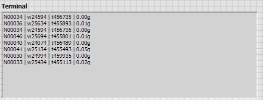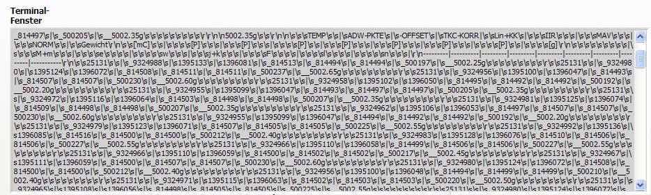 Ein kompletter String wär natürlich super kann ich aber leider nicht umsetzten da es eigendlich so gedacht ist das die Wägezelle die Darstellung im Terminal steuert (nach unten fortlaufend wie im Bild oder nur in einer Zeile) dazu schickt die Zelle unterschiedliche EOF-Zeichen einmal eben CR (in einer Zeile) und einmal CR plus LF (fortlaufend).