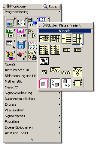 Das Linke ist ein Eigenschaftsknoten (Propertynode), das Rechte ist das Bündeln aus der Cluster Palette.