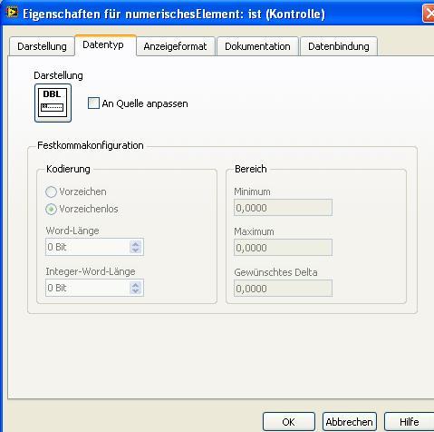 komisches Problem. Einfaches vi, nur 2 Elemente: Numerische Eingabe -> Numerische Ausgabe. Bei der Werteausgabe kann ich den Wertebereich über Eigenschaften nicht eingrenzen (über Eigenschaftsknoten wohl); ist immer ausgegraut. Egal, was ich für ein Zahlenformat wähle. Bei der Eingabe ist das kein Problem.