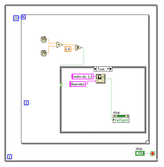 ich möchte eine While Schleife mit Hilfe der Property Node Val.(Signal) beenden. Es soll also, wie auf dem Screenshot zu sehen, bei einem bestimmten Wert ein Dialog Fenster erscheinen mit nur einer Wahlmöglichkeit. Beim drücken des "Beenden" Buttons auf dem Dialog Fenster soll das Programm abbrechen.