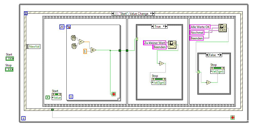 Bei der jetzigen Version funktioniert die For Schleife dank dem Conditional Terminal so wie ich mir das vorgestellt habe. Es wird auch bei Abbruch ein "true" in den zweiten Frame der Sequenz übergeben. Aber warum wird beim drücken des "beenden" buttons im erscheinenden Dialog Fenster "ignoriert". Und im Gegensatz dazu kann ich im dritten Frame der Sequenz das Programm weiter laufen lassen bzw. sogar beenden, und zwar auch mit Value(Signaling). Und warum wird die while Schleife mehrmals durchlaufen Sad