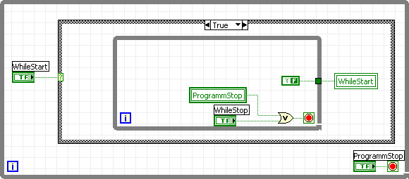 Wenn ich besagte Schleife außerhalb der Ereignisstruktur platziere und als "bei true fortfahren" konfiguriere, kann ich nicht starten, indem ich in der Ereignisstruktur den an den Bedingungsanschluss verbundenen Schalter per Referenz auf TRUE setze...