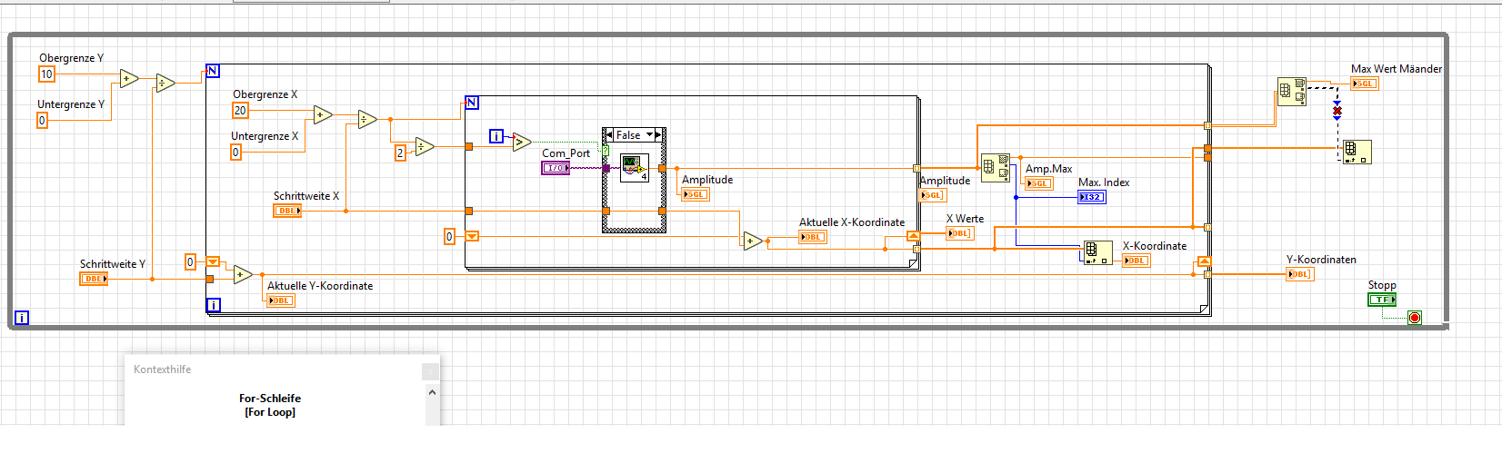 ja das habe ich erstmal nicht angehängt, weil ich prinzipiell kein Problem mit dem Vi hab, sondern eine Funktion suche. Aber du hast natürlich recht, so lässt sich bestimmt leichter eine Lösung finden. Kurz zu dem VI. Im Prinzip realisiere ich damit ein Mäanderförmiges abrastern einer Probe. Es wird in einer gewählten X-Schrittweite hoch gezählt und bei jedem Hochzählen das Sub-Vi für die Messwerterfassung ausgeführt und gemessen. Das gleiche in der Schleife fürs Runterzählen. Über die Definition eines Wertebreiches gucke ich ob ich mich noch auf meiner Probe befinde. Ist der Tisch bis an die Ober- bzw. Untergrenze gefahren, wird der Y-Wert um die Schrittweite erhöht. Der Tisch fährt dann wieder nur in X-Richtung. So weit so gut zu dem Mäander. Wie bereits gesagt messe ich zu jedem X-Wert eine Amplitude. Jetzt habe ich mir die Maximale Amplitude aus geben lassen und weiß durch den Max. Index eigentlich auch bei welchem X-Wert er sich befindet. Jedoch habe ich den X-Wert nur indirekt über den Index. Ich brauche ihn jedoch direkt. Ziel ist es nämlich das Globale Maximum der ganzen Probe (also Y bis an die Obergenze) zu ermitteln. Nachdem erfolgreichen Abrastern soll er an die Position des globalen Maximums zurückfahren. Daher benötige ich sogar die X bzw. Y-Werte. Habt ihr eine Lösung wie ich an die X bzw Y-Werte komme?
