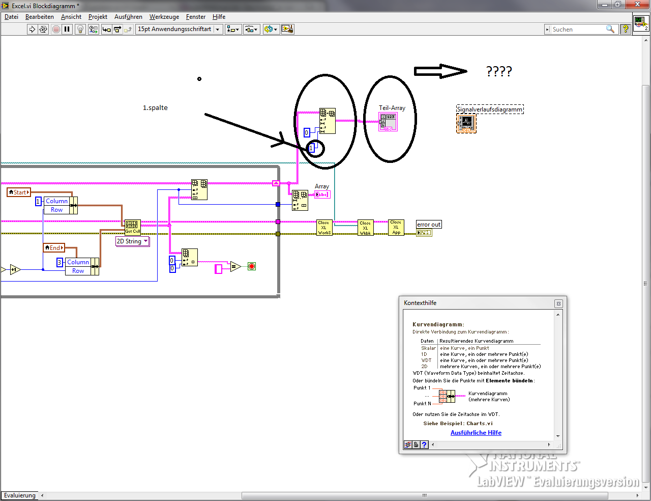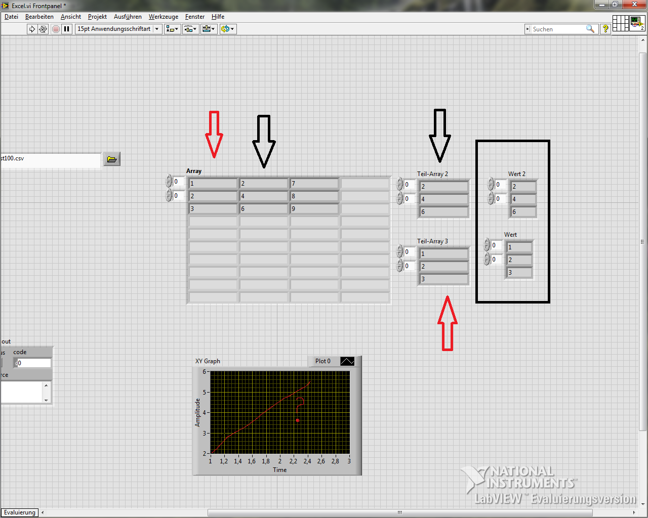 für einen Prüfstand muss ich werte aus Excel Tab werte einlesen und in labview anzeigen das klappt so weit ,mein problem liegt die werte in einem xy Graph zu zeichnen , weil mein Program die werte in einem Array schreibt ,nun wollte ich die werte in einem graph zeichnen , was muss ich tun ?? array in ..... umwandeln ?