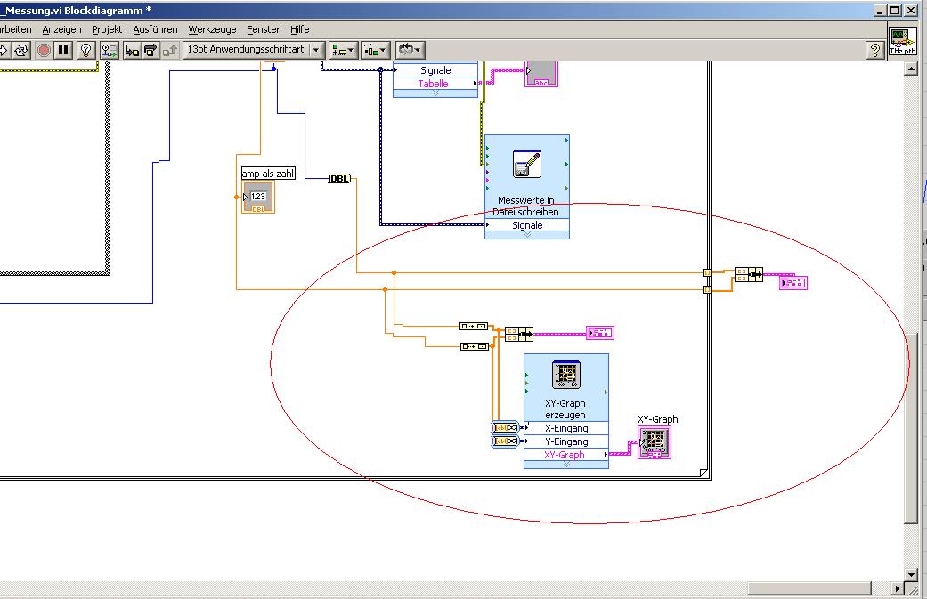 Einen XY-Graphen hab ich dann im übergeordneten Blockdiagramm an den entsprechenden Ausgang des Sub-VIs angefügt. Allerdings muss man dann warten, bis die gesamte Messung durch ist, bis die Messwerte geplottet werden. Wenn ich das ändern könnte, wäre das super, weil die Messungen sehr lange dauern und man vorher sehen könnte, wenn etwas nicht stimmt!