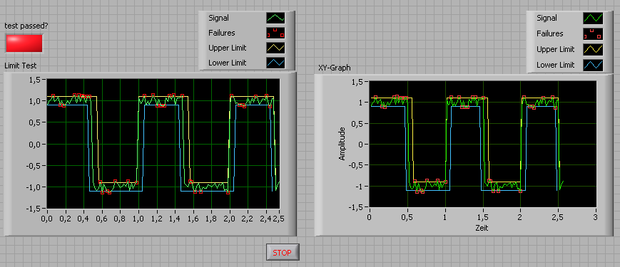 Die Limit VI's aus dem Beispiel kommen doch mit einem Cluster für die Limits zurecht. Da reicht es doch, die Limits einmal in einem Cluster zu beschreiben und dann damit mehrere Limit-Überprüfungs (Namen vergessen..) VI's zu füttern. Wenn ein Limit VI nicht mit nem Array aus mehreren XY-Kurven zurecht kommt, dann macht man halt für jede Kurve eine eigene Limitbetrachtung. Am Schluss blendet man in der XY-Graphlegende einfach alle Limits bis auf eins aus.