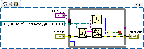 Ich möchte eine einfache Text Datei an die RS232 schicken. In der Datei steht in jeder Zeile der selbe Satz, zum Beispiel "Der Sommer ist toll", nur teilweise mit hizugefügten oder entfernten Buchstaben, und die Zeilen sind durchnummeriert. Die Datei soll Zeilenweise an die Schnittstelle geschickt werden, solange, bis alle Zeilen durch sind. Es hört sich für euch bestimmt ganz einfach an, aber ich komme irgendwie nicht weiter. Im Anhang könnt ihr das Sub VI sehen, welches für das Schreiben der Datei zuständig ist. Ich habe versucht es mit einer for-Schleife zu realisieren und wollte einen Vergleich zwischen den durchlaufenen Zeilen und der gesamten Zeilenanzahl durchführen, um die Zahl der Durchläufe zu definieren. Meine Frage ist, wie kann man es in LabVIEW realisieren, dass die Zeilen gezählt werden?