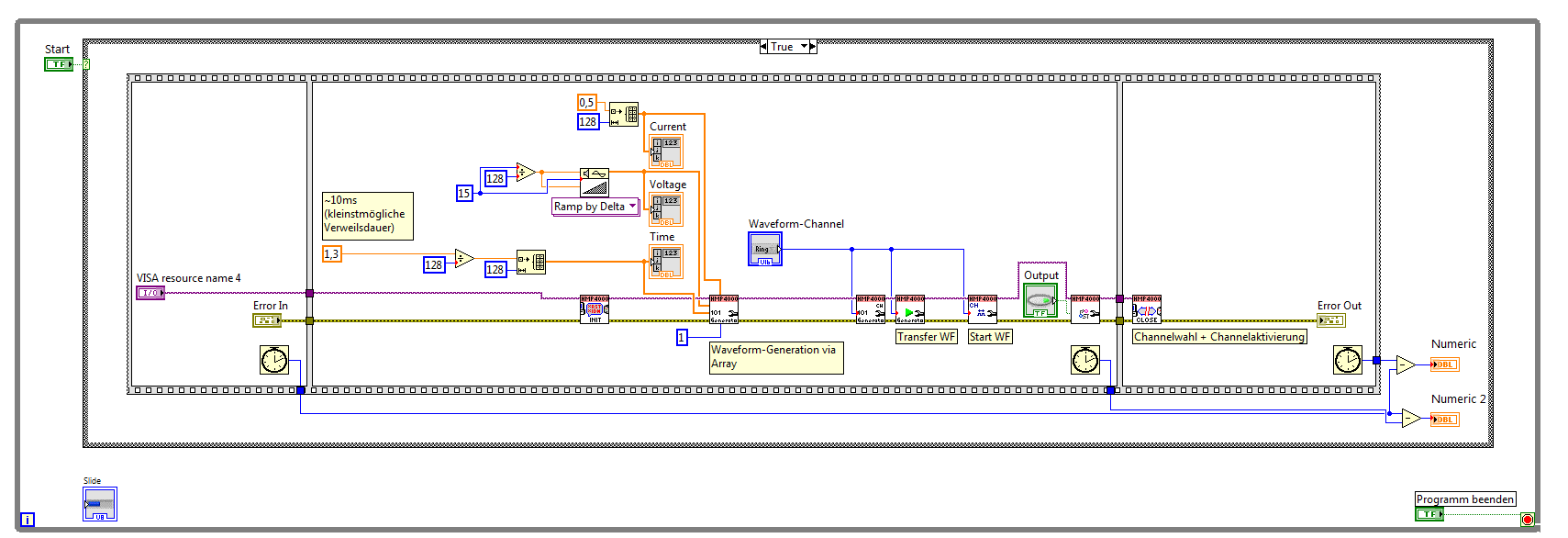 Zum Programm: Es wird einmal die Case-Struktur aktiviert. Dabei wird der der Kanal der Spannungsquelle auf Output gesetzt. Ich benötige die Zeit vom Drücken des OK-Buttons bis zum Aktivieren des Kanals.