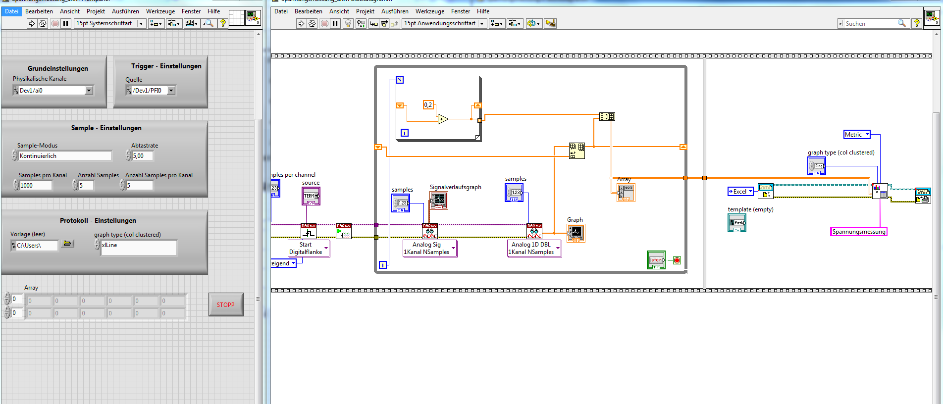 Die Zählschleife habe ich einfach nur dort eingefügt um laufende Werte für mein 2D Array zu bekommen. Ich bekomme ja "nur" die Spannungswerte aus dem "DAQMX lesen Vi", leider weiß ich nicht wie und wo ich die passenden Zeitwerte herbekomme..