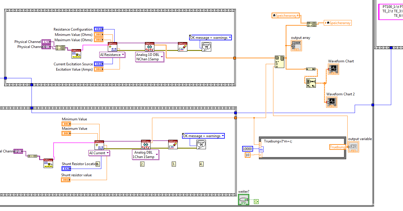 ich bin absolute LabViewAnfängerin und mir wurde für meine Bachelorarbeit ein Programm vorgesetzt, mit der zum Einen die Messwerte von zwei Pt100 (oberer Teil im Bild) und zum Anderen das Signal einer Trübungssonde (unterer Teil im Bild) aufgenommen werden. Das ganze wird auch jeweils in einem Diagramm während der Laufzeit kontinuierlich aufgetragen und wenn ich es stoppe, kann ich die bis zum Zeitpunkt des Stoppens aufgenommenen Daten in einer Textdatei speichern.