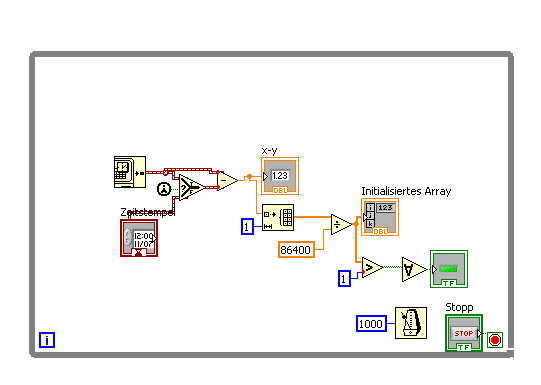 Ausserdem möchte ich gerne, dass du noch einmal über den Sinn des "Initialisiere Array" in deinem VI nachdenkst und weshalb du erst durch 86400 teilst und dann das Ergebnis gegen 1 prüfst anstatt gleich gegen 86400 zu prüfen wie vorher gezeigt.