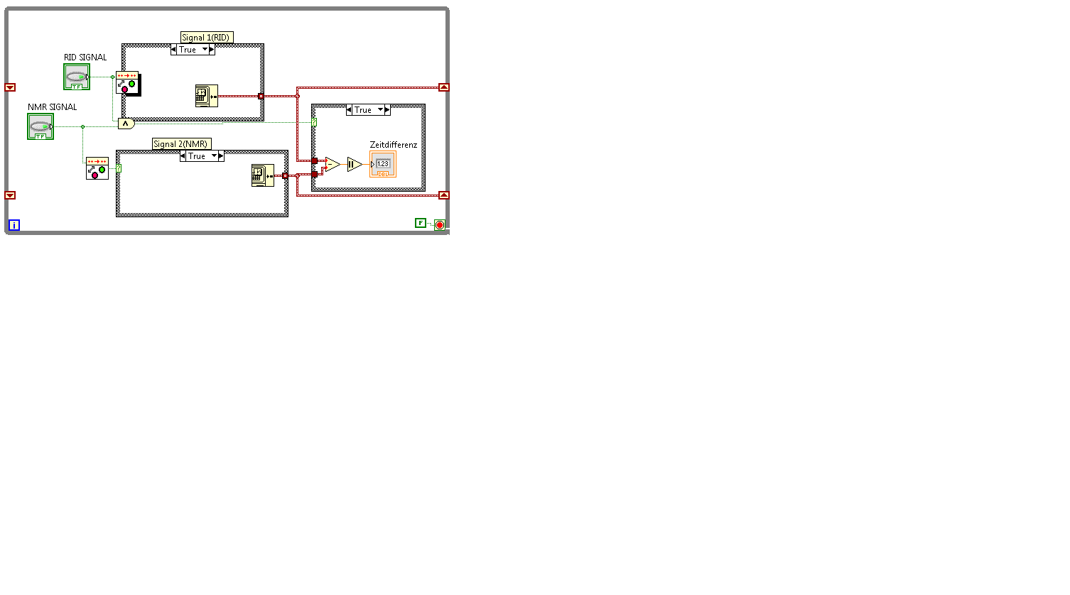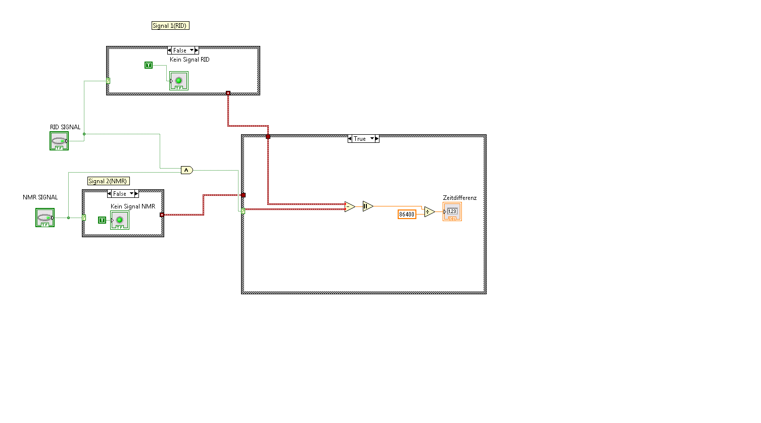 Es geht darum die Zeitdifferenz zwischen 2 Signalen zu messen, die zu beliebiger Zeit auftreten können. Meine Idee war dafür zwei Zeitstempel zu benutzen, da , wenn ich das richtig verstanden habe Tick Count nur bedingt geeignet ist um reale Zeitdifferenzen zu müssen. Ich entschuldige mich im Voraus dafür, dass ich leider im False Fall bin in meinen Anhang( komme jetzt leider nicht an das Programm ran, sonst würde ich natürlich neue Bilder nehmen) , damit sieht man das wichtige leider nicht, ich habe noch ein zweites Bild von einer früheren Version angehängt.