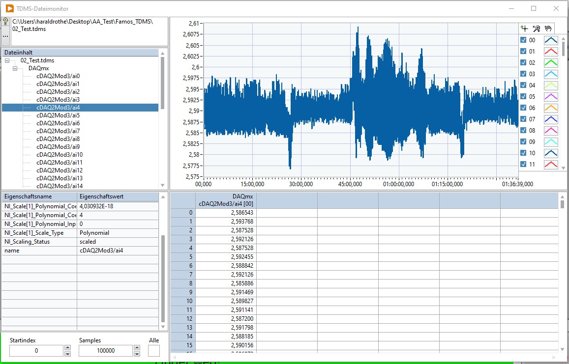 Für eine neue Messaufgabe habe ich einen DAQ Datenlogger programmiert, welcher Spannungs- und Temperaturwerte mit 100 Hz aufnehmen soll, Aufnahme und TDMS-Schreiben wird über die DAQ VIs erledigt (TDMS-04.jpg). Um den Bediener eine Möglichkeit zu geben, die Messung auch während der Laufzeit zu überwachen, wollte ich den TDMS-File Viewer nutzen, was grundsätzlich auch sehr gut klappt. Allerdings wird, wenn ich den Viewer während der Messwertaufnahme starte, die Zeitschiene nicht korrekt dargestellt und das Eigenschaftenfeld ist nicht komplett gefüllt (TDMS_01.jpg), dies ändert sich erst nach dem stoppen der Messwertaufnahme (TDMS_03.jpg).