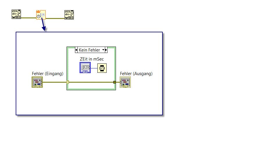 Ein eigenes VI mit der Wait - Funktion und einer Error (Eingang) und Error (Ausgang). Für die Wait - Funktion habe ich einen Zahlen Eingang noch dazu genommen. Dieses VI kann ich dann zwischen die Befehle über die Error Leitung hängen. Dann wird der erste Befehl ausgeführt, die Zeit abgewartet und der nächste Befehl wird ausgeführt.