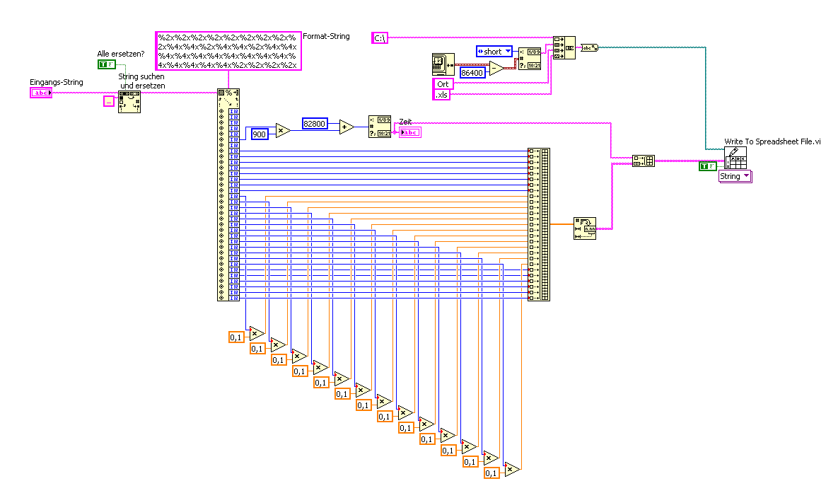 wenn Du die rote Ziffer im Frontpanel änderst, änderst sich die Uhrzeit in 15 Minuten Schritten. Das passiert genau 96 mal. Somit hab ich den ganzen Tag in 15 Minuten Schritten protokolliert. Zu jedem 15 minütigen Intervall gibt es eine Reihe von Mittelwerten. Diese kommen im Anschluss an den Zeitraum. Nun muss ich den 00:15 String als 00:15 Wert in der ersten Spalte darstellen. Ich hatte versucht Konstanten hochzuzählen. Allerdings kann ich den Doppelpunkt nicht als Konstante (Wert) angeben. Wie gesagt, nun muss der Ausgangsstring beim Anzeigeelement "Zeit" in den "Array erstellen" Eingang.
