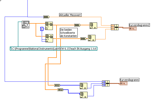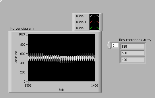 ich habe mit LabVIEW ein VI erstellt mit dem ich ein Farbsensor steuern kann, dieser ist in der Lage Farben nicht nur wiederzugeben sondern auch zu erkennen. Er misst die Farben in ihrem Rot, Grün und Blau Anteil. Man kann Farben Teachen und wenn diese Farbe gemessen wird schaltet der Sensor. Es gibt ein Befehl zum schwellen auslesen der geteachten farbe, d. h. der Sensor gibt dann für jeden Farbanteil 2 Wete aus, die Schaltgrenzen. Zwischen muss der Farbwert sein damit geschalten wird. Außerdem gibt es noch den Befehl Tastbetrieb welcher die aktuellen Farbwerte zurückgibt. Ich würde gern 3 Liniendiagramme mit je 3 Graphen erstellen. Also wenn jemand den Sensorbetrieb wählt soll ihm die Farbe in ihren Anteilen in den Liniendiagrammen angezeigt werden und zusätzlich die Schaltgrenzen als Linien dargestellt werden. Das Problem dabei ist: