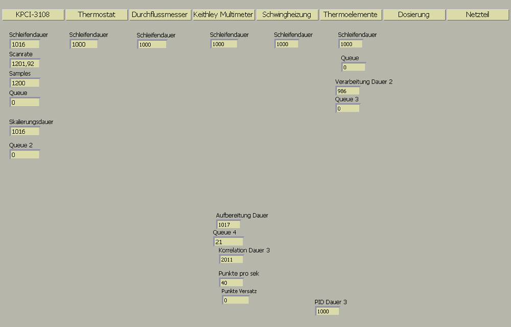 [attachment=61179:SUB_Date...relation.vi]Och menno - LV ist doch echt ein gemeines Programm. Den ganzen Tag habe ich das VI umgeschrieben und mir wirklich Gedanken über den Datenfluss gemacht und nun klemmt es noch mehr. Das ursprüngliche "all in one" VI wo alles in einer einzigen while steckte hat irgendwas zwischen 5 und 25 % CPU gezogen. Dieses hier zieht fast durchgehend 100% und insbesondere die Korrelationsschleife braucht länger als 1000 ms. Interessanterweise braucht sie immer irgendwas um 1000 oder 2000 aber nie z.B. 1500 ms. Wenn man etwas wartet und nicht am Rechner arbeitet rattert sie mit Durchlaufzeiten von 5-10 ms die Queue runter, um dann wieder nachzuhängen. Könnt ihr mir sagen, was ich hier falsch mache? Sind Queues generell Systembremsen? In meinen steckt ja noch nicht mal viel drin - nen paar Arrays zu vielleicht 500 Werten ist doch eigentlich nix...?!