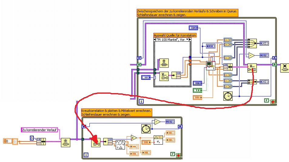 Zum gezeigten VI: Ich habe mir inzwischen selbst eingestanden, dass es sehr unglücklich strukturiert war. Darum sind nun die "nice to know" Quellen in eigene Schleifen gewandert und übernehmen dort auch gleich die Darstellung, so dass 3 Queues weniger nötig sind. Momentan kämpfe ich mit den beiden Datenquellen für die Temperaturverläufe. Deren Synchronität ist zwar im Sekundentakt (gemittelter Verlauf) wichtig aber das könnte man via zweier Q's und getrennter While-Schleifen recht gut abarbeiten. Wo es gerade klemmt ist die Korrelation, die wahlweise eine der beiden Quellen nutzt. Lege ich aber wie bisher beide Q's an einen case und wähle in diesem aus, wer weiter verarbeitet wird, wartet die Schleife trotzdem immer auf beide Werte auch wenn einer davon im Case verpufft. Ich muss die Q's daher irgendwie vorher "umschalten", d.h. die Daten der einen lesen, während die Daten der anderen mit "Queue leeren" zeitgleich vernichtet werden. Schaltet man die andere Quelle auf den Korrelator wird der Spieß einfach umgedreht. So bekäme der Korrelator immer nur einen verlauf und wartet nicht auf den anderen (vorausgesetzt "Q leeren" erwartet keine enthaltenen Werte)