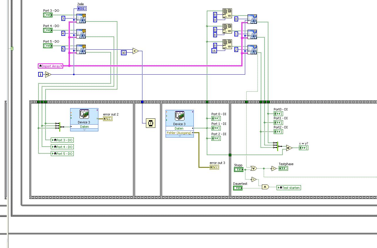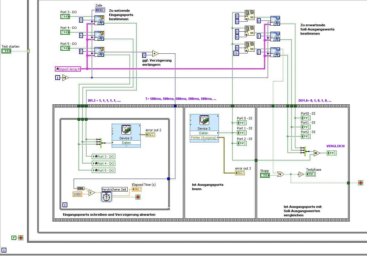 So, jetzt habe ich auf dem Controller nich nur ein Rechtecksignal, sondern auch eine Einschaltverzögerung von 2s. Wenn ich nur ein Bit setze, 2s warte und abfrage ob es da ist, dann krieg ich beim Vergleichen ein "False" und erst im nächsten Schleifendurhclauf ein"True" Sad. Deswegen habe ich zu Verzögerung 30ms dazuaddiert. Denn wenn ich 2s und 30ms auf die Einschaltverzögerung warte, dann krieg ich beim Vergleichen ein "True" Smile