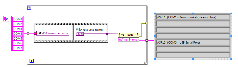 Das Array mit vordefinierten COM-Ports, das geht aber dynamischer: VISA Find Resource