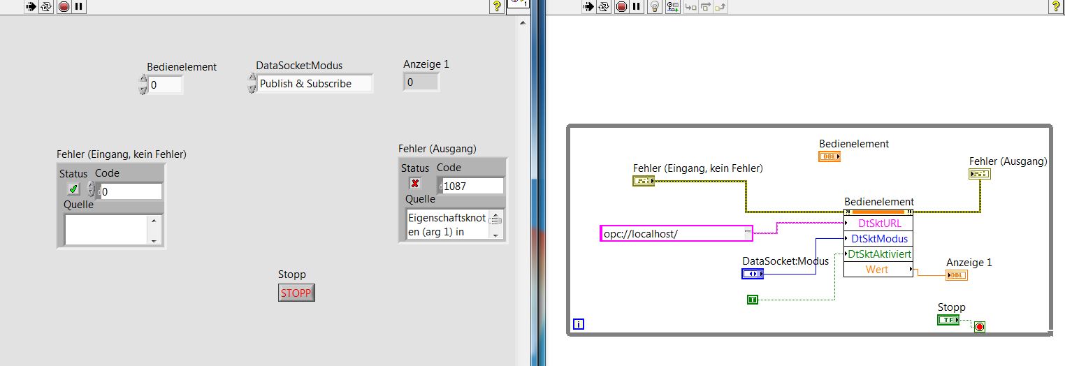 Wie kann man die Daten vom OPC Server über Datasocket Property Nodes lesen und schreiben? Ich habe ein kleines Beispiel gemacht und verglicht. Bei Datasocket Property Nodes zeigt es immer Fehler 1087 ( keine Datasocket Verbindung) (sieh. Bild 2 u. 3). Ich weiß nix, wie HMI mit OPC Server über diese Variante ansprechen kann. Was habe ich hier falsch verstanden? Kannst Du mir eine kurze Erklärung geben.